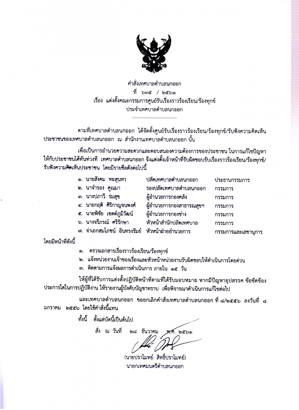 คำสั่งเจ้าหน้าที่ประจำศูนย์รับเรื่องร้องเรียน/ร้องทุกข์