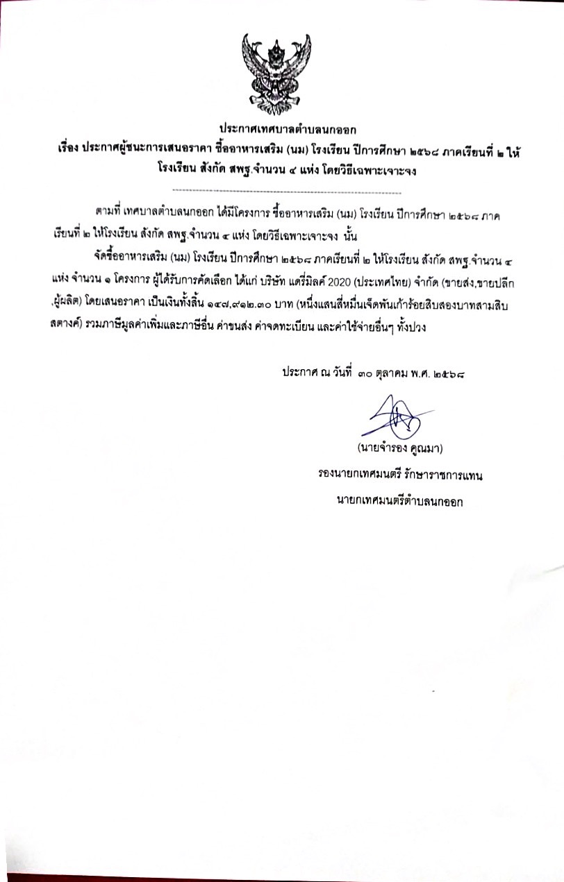 ประกาศผู้ชนะการเสนอราคา ซื้ออาหารเสริม (นม) โรงเรียน ปีการศึกษา ๒๕๖๘ ภาคเรียนที่ ๒ ให้โรงเรียน สังกัด สพฐ. จำนวน ๔ แห่ง โดยวิธีเฉพาะเจาะจง 10 ต.ค. 68 แชร์ ดาวน์โหลดเอกสารแนบ : S__53837894_0 (jpg)